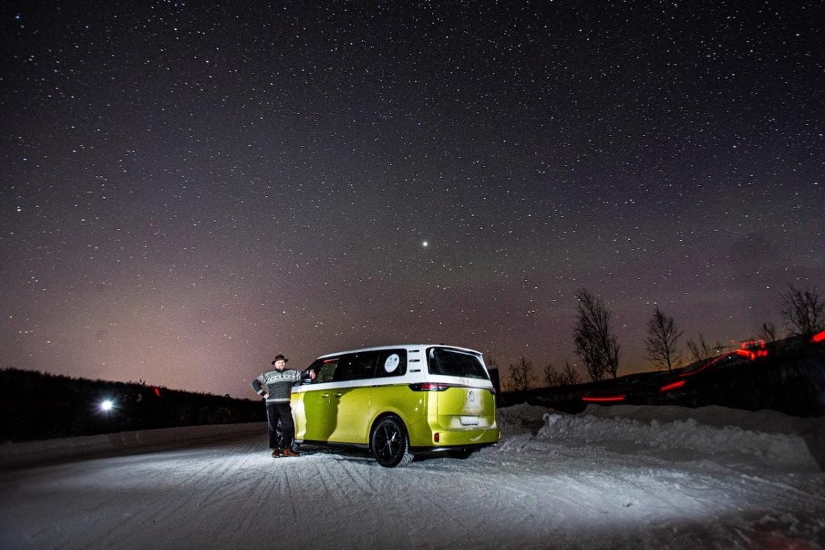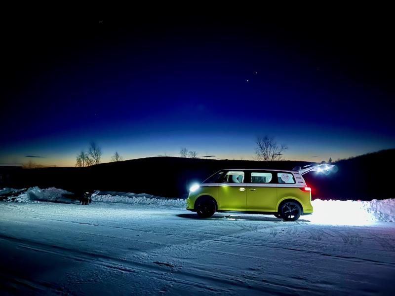 Myös käytönnössä pakettiautopohjaisen pienoisbussin äänimaailmaa kiiteltiin. Tietenkin sähköautossa moottorin pärinät loistavat poissaolollaan joka tapauksessa, mutta muiltakin osin ajo- ja matkustusmukavuus olivat kohdallaan myös äänimaailman puolesta. Omaan ID.4:ään verrattuna hiekoitetulla lumisella tiellä ajaessa hiekan rapina kuului jonkin verran selvemmin sisälle, mikä johtunee siitä, että Buzzissa ei ole helmoissa muoveja peltien päällä. Radiosta kuunteli mielellään myös norjalaisten DAB-lähtyksiä, mutta hifistit luonnollisesti rakentavat hippibussiinsa aivan toisen tasoista äänentoistoa.