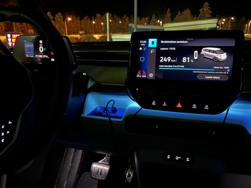 Matkaseurue ihmetteli toistuvasti Buzzin maltillista kulutusta ja huomiona oli myös, että autossa tarkeni hyvin myös -20°C kelissä kylmänä ilman esilämmitystä lähtien, eikä -24°C matkanvarrella kylmentänyt sisätilaa. Mittasin, että auton vastuslämmitys toimii -20°C kelissä Hi-pyynnöllä 7 kW:n teholla, koeajoautossa ei ollut ilmalämpöpumppua.