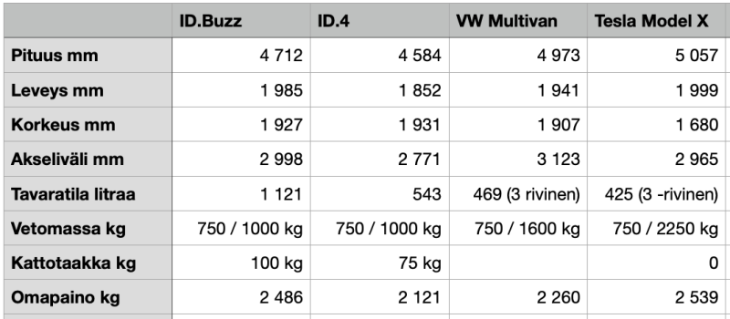 ID.Buzz mitat verrattuna muutamaan muuhun autoon kertovat, että kyseessä on MEB-alustaiseksi sähköautoksi iso vaunu ja tämä tuntuu sisällä. Otin mielenkiinnosta vertailuun myös saman merkin hybridi seitsemän paikkaisen Multivanin mitat ja ne oikeastaan yllättivät, kuinka lähellä Buzz on jopa sen mittoja. Vertailin myös kiinnostuksesta tilavaan Teslan Model X:ään ja se on korkeutta lukuunottamatta joka suuntaan vielä suurempi. Taulukossani tavaratilojen vertailu ei ole reilu, koska Multivan sekä Model X ovat kolmirivisten tilaa ja kaikki istuinrivit käytössä.