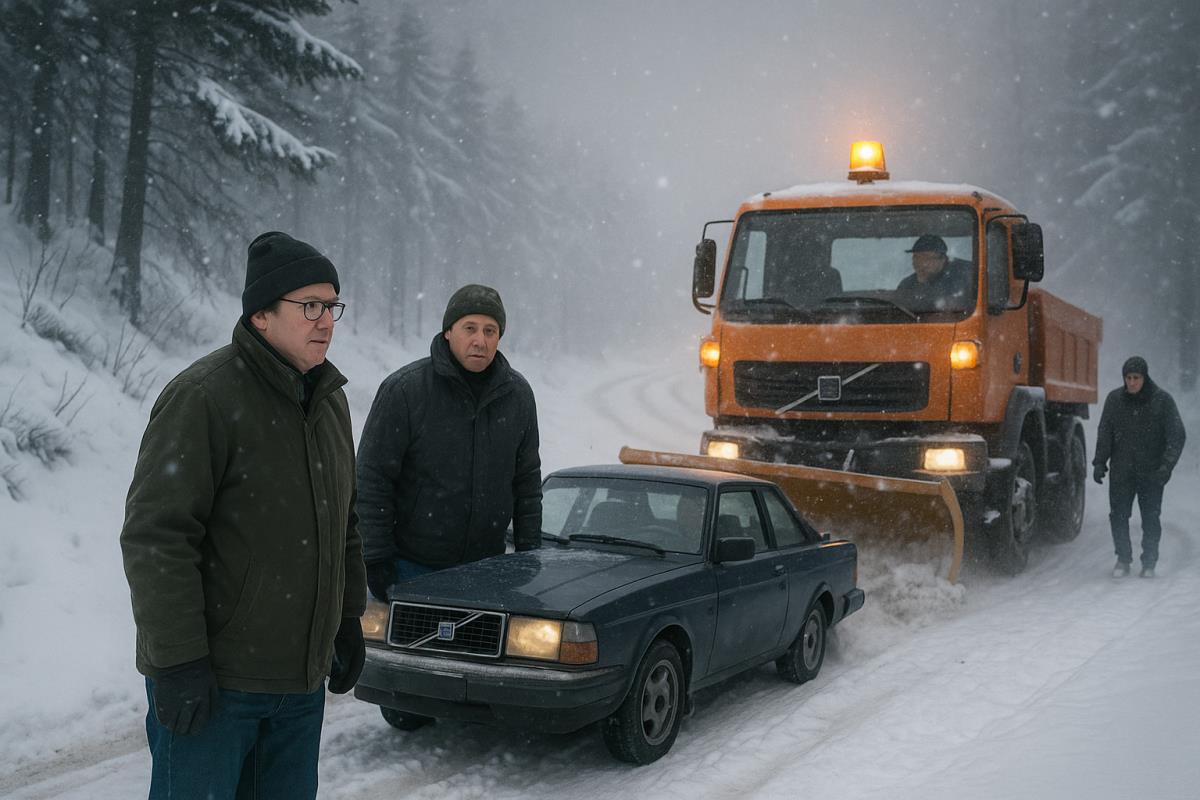 Lopulta tuli vastaan ylämäki, johon rengaskomboni ei enää purrut, vaan auto jäi mäkeen kiinni. Tuijotin tyhjyyteen tajuttuani, että mitään ei ollut tehtävissä. Kuin ihmeenä ylämäen päälle tuli aura-auto. Nousin ulos autosta. Niin nousi myös auro-autonkuljettaja, jotka minulle ensimmäisinä sanoina huusi, että minun pitäisi siirtää auto pois edestä. Vastasin, että auto on jumissa enkä saa sitä liikkeelle, ja pyysin häneltä apua. Tämä ei aura-autonkuljettajaa tuntunut kiinnostavan ja jäimme vain tuijottamaan toisiamme.