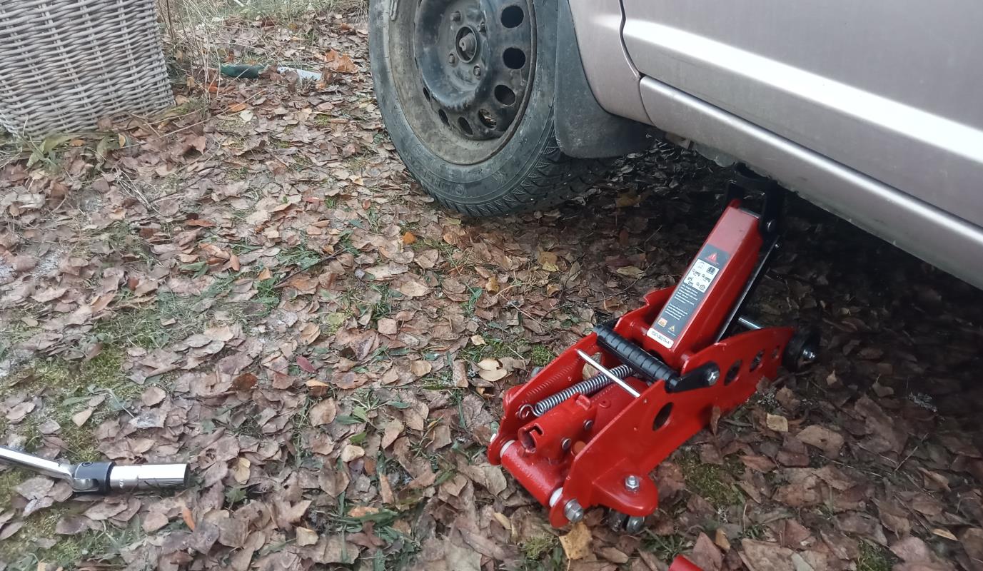 Volvo, valkoinen valaani nosti vaivatta kylkeään tunkin ottaessa tukea kohmeisesta maasta. Ensimmäinen voitto. Jäljellä olisi 20 pulttia ja neljä rengasta. Jokavuotiseen tapaan renkaat olivat pulttien irrotuksen jälkeekin kovassa kiinni. Tämä ei välttämättä ollut huonoa asia. Yksi suurimmista peloistani on, että rengas lähtee irti ajaessa. Nyt tuntui, että pysyisivät kiinni ilman pulttejakin. Otin maasta tukevan makuuasennon renkaan edessä ja potkin kuin viimeistä päivää kovapäistä rengasta. Tällä metodilla rengas kerrallaan irtosi ja sai tilalleen nastaisen sisarensa.
