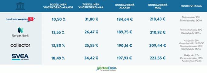 Rahoituspalveluiden hintoja vertaileva VertaaEnsin laski 4 000 euron kulutusluoton kustannukset neljälle eri edullisimmalle palveluntarjoajalle. Sivusto käytti vertailussaan 24 kuukauden takaisinmaksuaikaa. Tulokset käyvät ilmi oheisesta taulukosta.